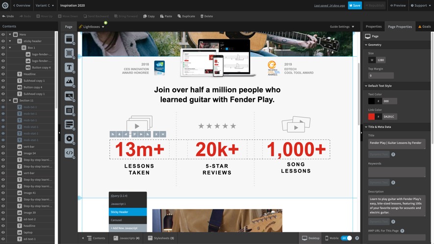 In collaboration with Fender's internal research and content teams, we’ve rolled out several successful marketing campaigns and creative web experiences across multiple platforms. Our team designed and implemented Fender creative onto custom landing pages within their backend service, Unbounce. By setting up several page variants, Fender’s team is able to track conversion rates, set up A/B testing, and go to market quickly with results that they can easily track.