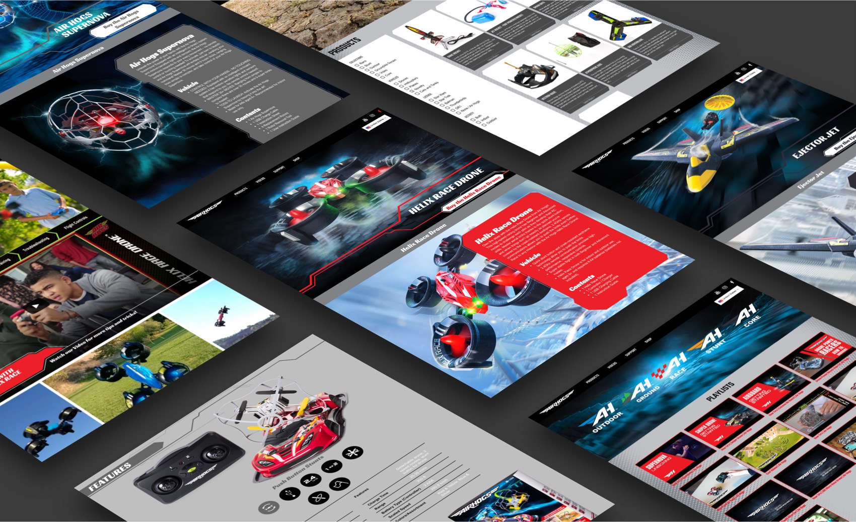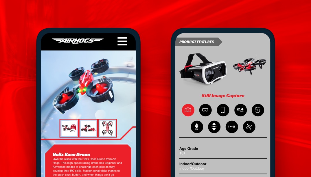 The Air Hogs website accomplished all of its goals... it was kid-friendly, it showcased the various lines of Air Hogs toys, and it displayed the product data dynamically. The increase in product shots and addition of videos, when compared to the old website, were a welcome addition that helped propel the Air Hogs brand to new heights!