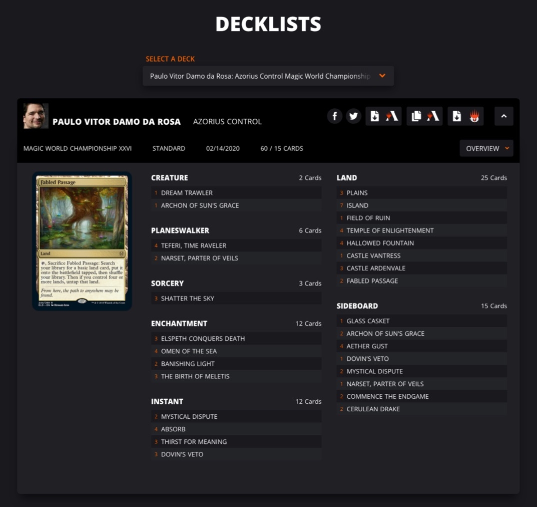 Since Magic: the Gathering is based on cards and card decks, a custom solution was also created to showcase cards and deck lists. Users can see a list of all the cards a player used in their deck, along with the card art images, ways to share the deck on social media, and aunique feature for where users could download the deck lists in order for them to then import them into the online Arena game to try them out for themselves!