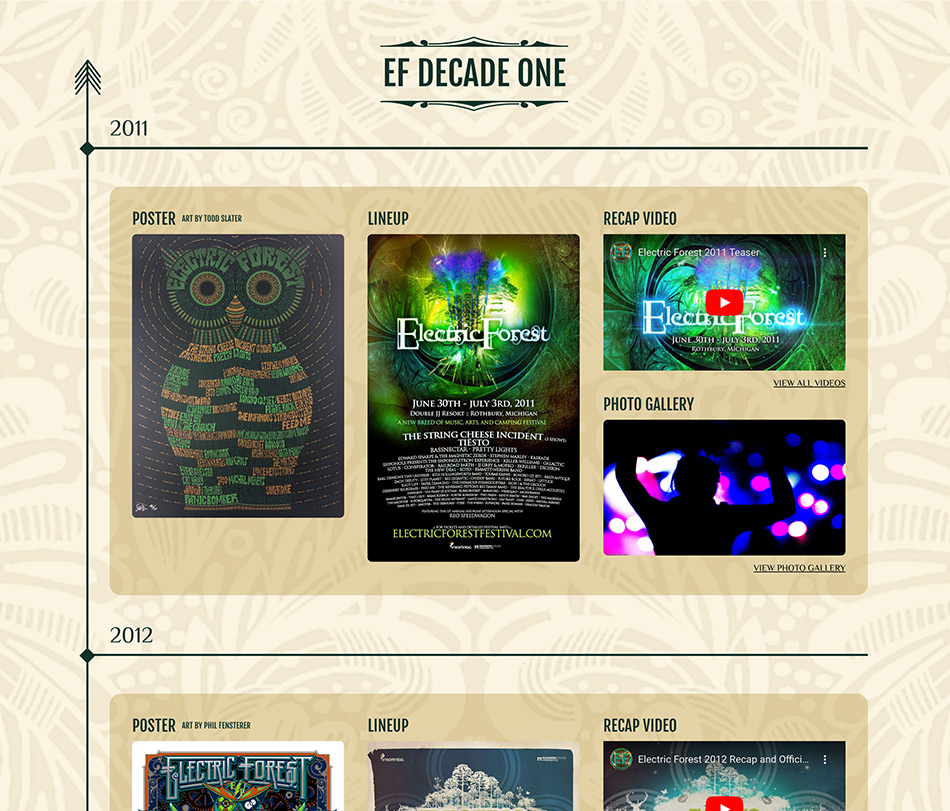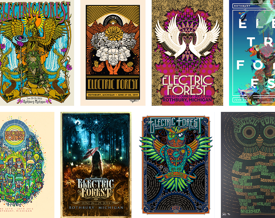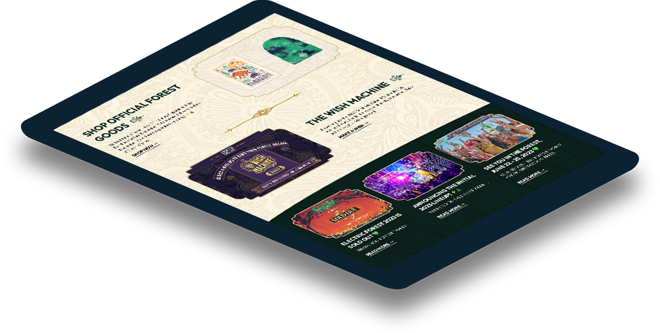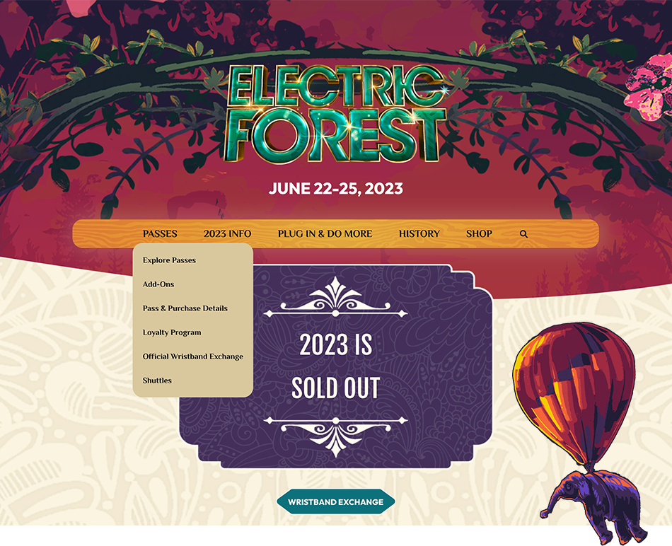 A promotional website for the 2023 Electric Forest music festival, featuring event details, ticket information, and highlights from the festival’s unique lineup and immersive experiences.