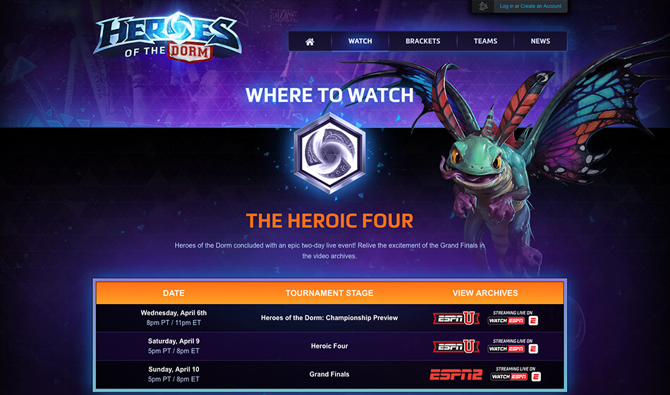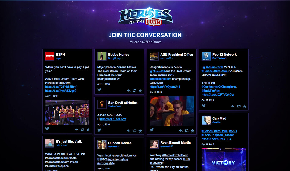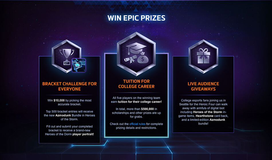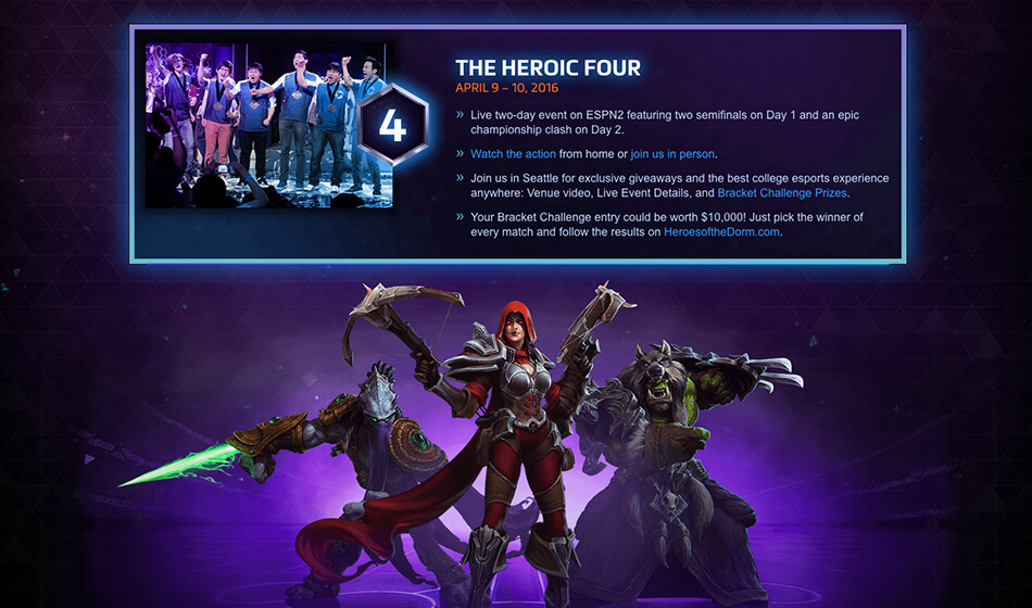 Heroes of the Dorm was an esports tournament focused on the game "Heroes of the Storm," created by Blizzard Entertainment. The first tournament took place in 2015, and it featured college teams competing for scholarships