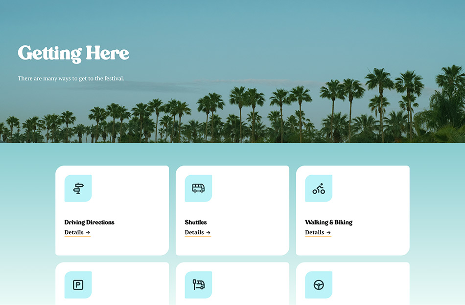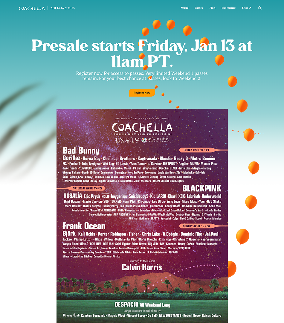 In 2023, Haven Agency partnered with Coachella to design and develop their website, powered by Roadie, our custom-built CMS. We worked closely with the Coachella team to create a seamless, interactive user experience that reflects the festival's energy and culture. With Roadie at the core, the site features intuitive content management, flexible updates, and a dynamic interface, making it easier for Coachella to keep fans informed with artist lineups, event details, and much more.