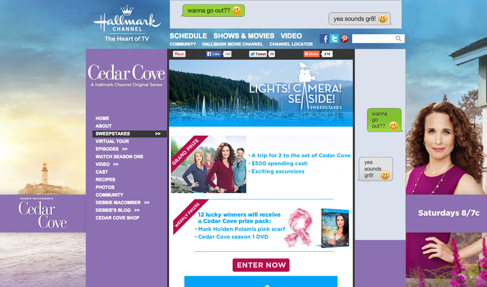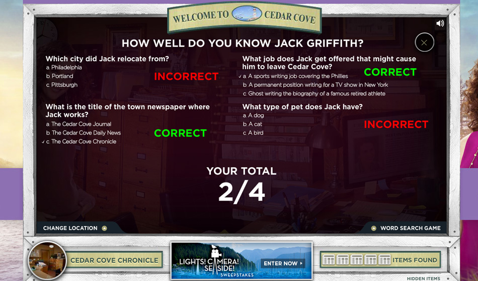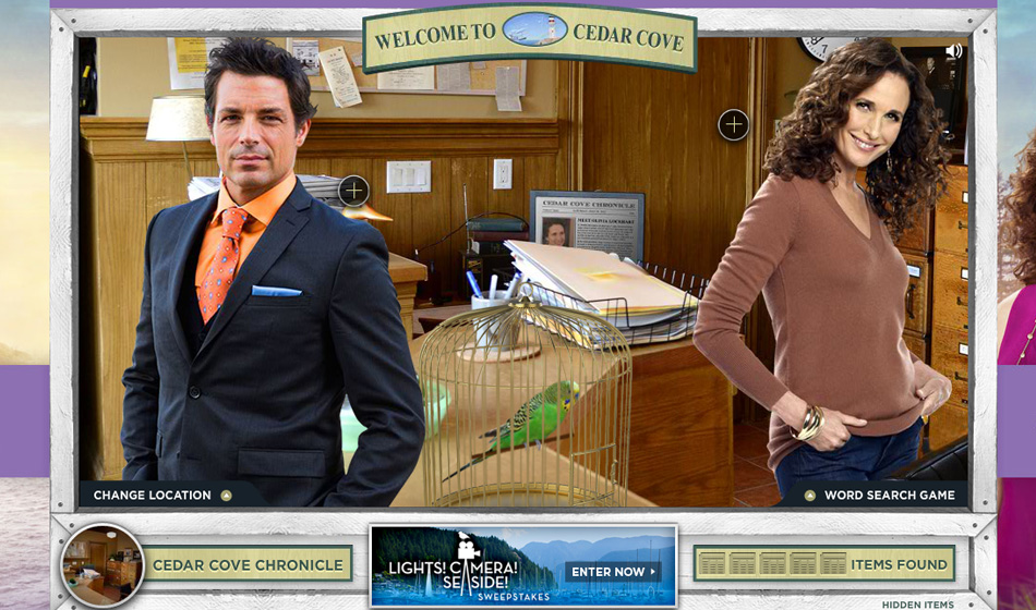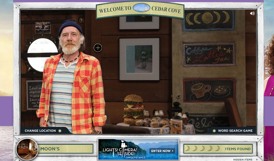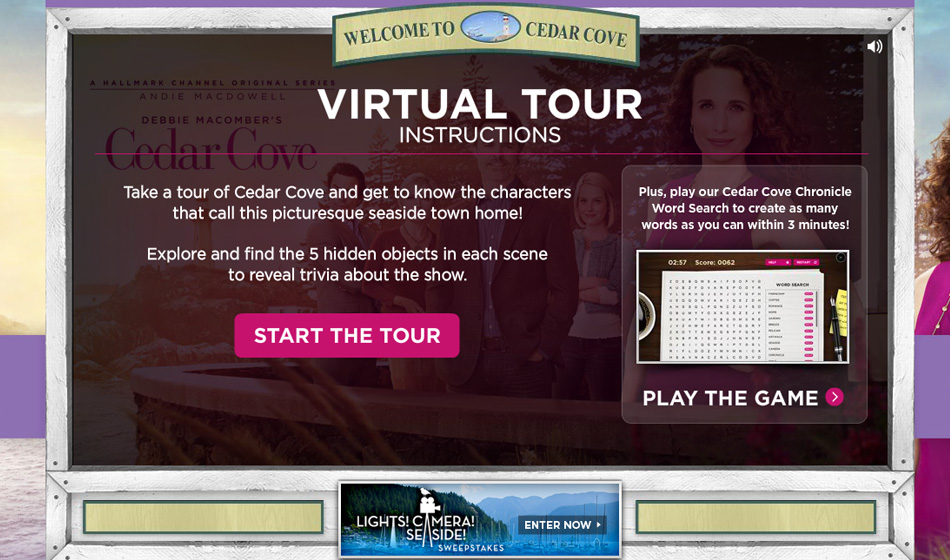 Haven partnered with Cedar Cove to create an innovative Cedar Cove: S2 Virtual Tour alongside a sweepstakes campaign. Fans could virtually explore the world of Cedar Cove by scrolling through interactive hotspots that revealed exclusive content related to Season 2. This immersive experience allowed users to engage with the show's setting and characters while deepening their connection to the brand. Haven developed the dynamic digital experience, combining entertainment and fan engagement seamlessly.