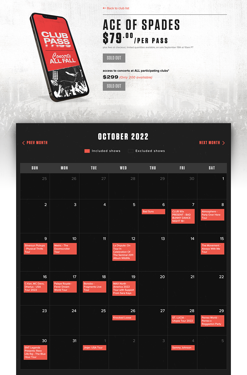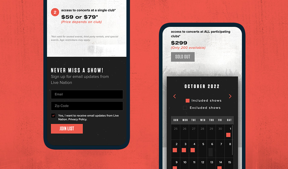 Haven partnered with Live Nation to design and develop a website promoting the Club Pass, a unique pass that gave users access to visit all participating clubs. The website provided a seamless, user-friendly platform where users could easily purchase passes, explore participating venues, and unlock exclusive benefits. Haven’s design enhanced the promotional campaign, offering music fans a convenient and exciting way to experience multiple live music events with just one pass.