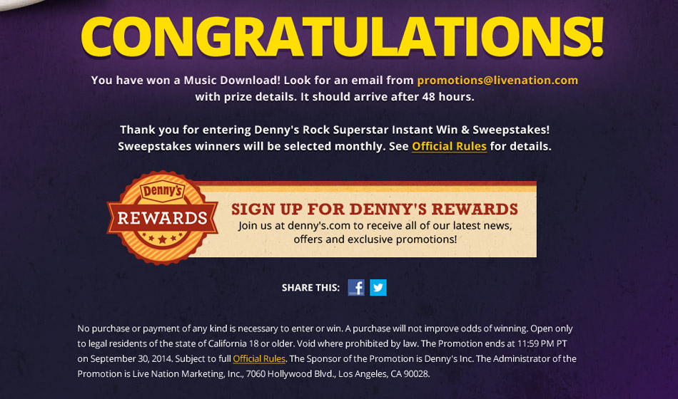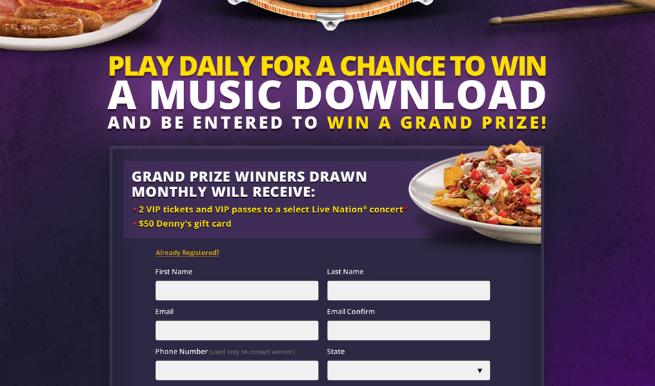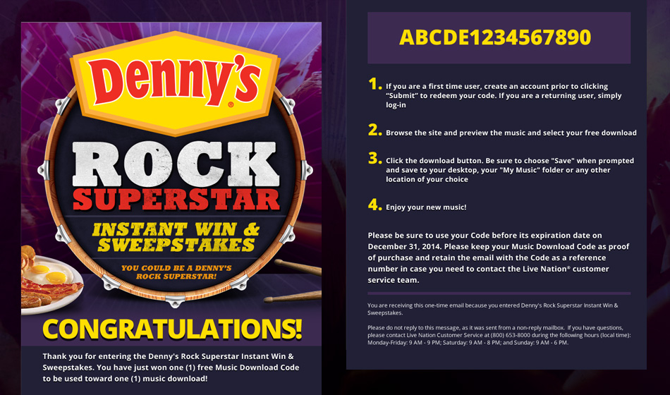 "Rock Superstar" was a promotional website where fans entered to win epic prizes, all in collaboration with Denny’s—bringing music, giveaways, and rock star vibes together!