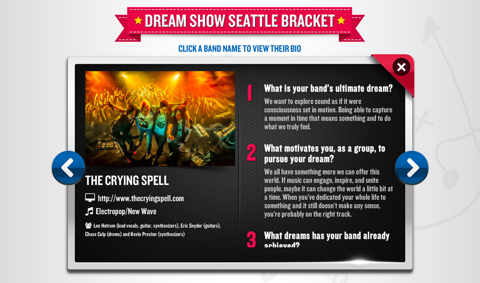 Dream Show Seattle was a promotional website where fans voted to launch their favorite local bands to stardom, giving emerging Seattle musicians a chance to shine.